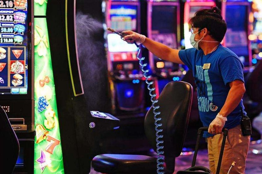 Foxwoods Resort Casino의 직원인 Limuel Toledo는 2020년 5월 28일 슬롯머신에 소독제